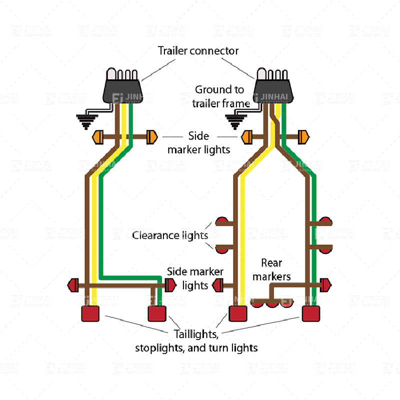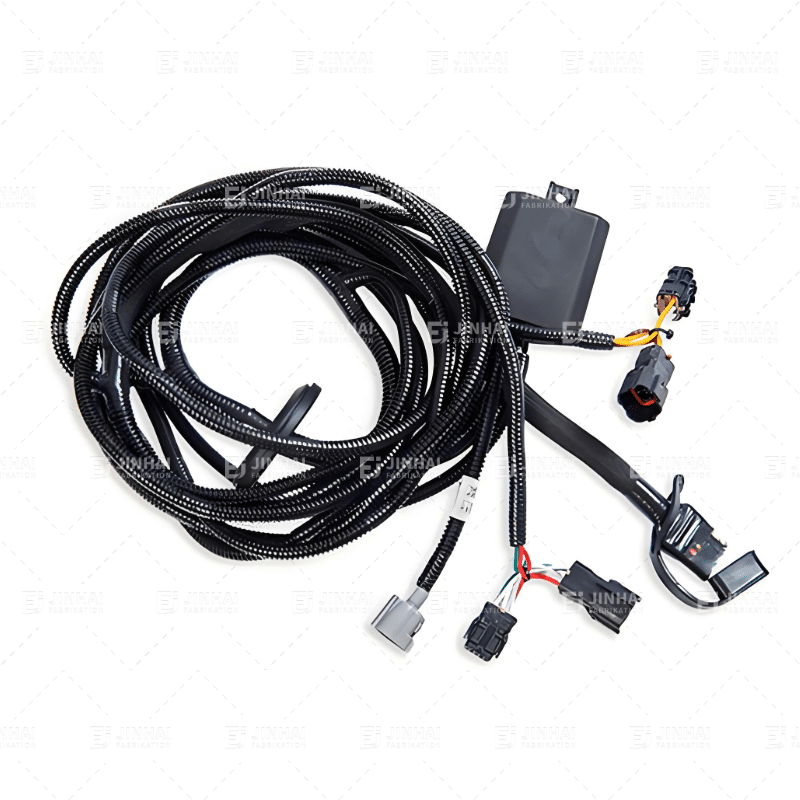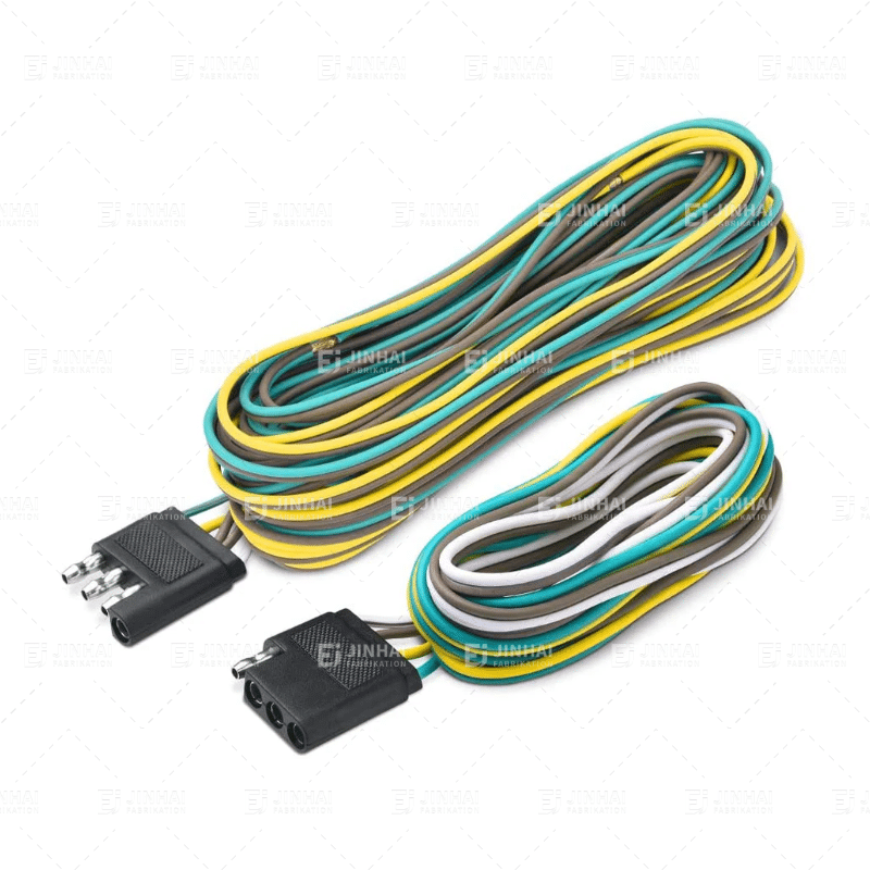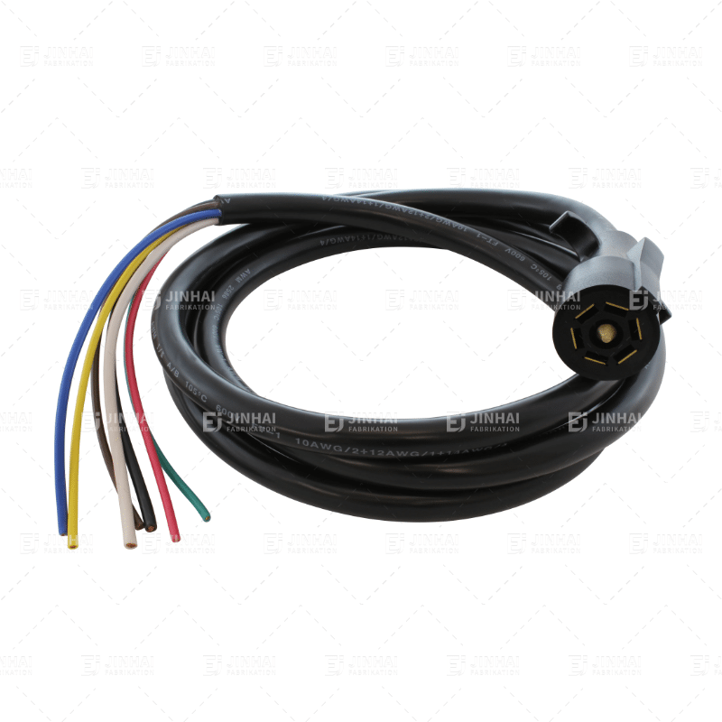 Los mazos de cables para remolque aseguran la correcta transmisión de señales entre el vehículo tractor y el remolque, incluyendo luces de freno, intermitentes y luces de reversa. Los mazos de cables JinHai utilizan material protector de PVC resistente a la abrasión y terminales de cobre estañado. Cumplen con el estándar SAE J1128 y son compatibles con varios tipos de conectores, incluyendo conectores de 4, 5 y 7 pines.
